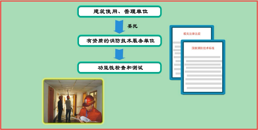 年度檢測是建筑使用、管理單位按照相關(guān)法律法規(guī)和消防技術(shù)標準,每年度開展的定期功能性檢查和測試;建筑使用、管理單位的年度檢測可以委托具有資質(zhì)的消防技術(shù)服務單位實施。年度檢測內(nèi)容和要求見本章第四節(jié)“系統(tǒng)的檢測與驗收”中“系統(tǒng)檢測”的內(nèi)容。