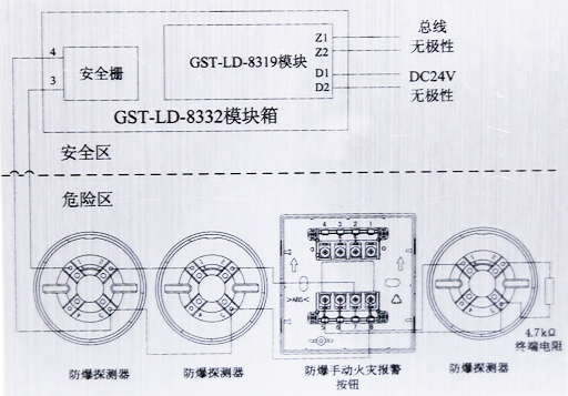 GST-LD-8332編址接口模塊(以下簡稱編址接口模塊)可與防爆設備(防爆感溫、感煙、煙溫復合探測器、防爆手動報警按鈕等)配接,組成本安型防爆系統(tǒng)。一旦發(fā)生火災,編址接口模塊將報警信號通過總線傳入火災報警控制器(以下簡稱控制器),控制器產(chǎn)生報警信號并顯示出編址接口模塊的報警地址信息。當編址接口模塊本身出現(xiàn)故障時,控制器將產(chǎn)生故障信號并顯示編址接口模塊故障地址信息。