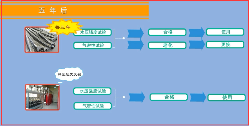 2、五年后,對釋放過滅火劑的儲瓶、相關(guān)閥門等部件進行一次水壓強度和氣體密封性試驗,試驗合格方可繼續(xù)使用。